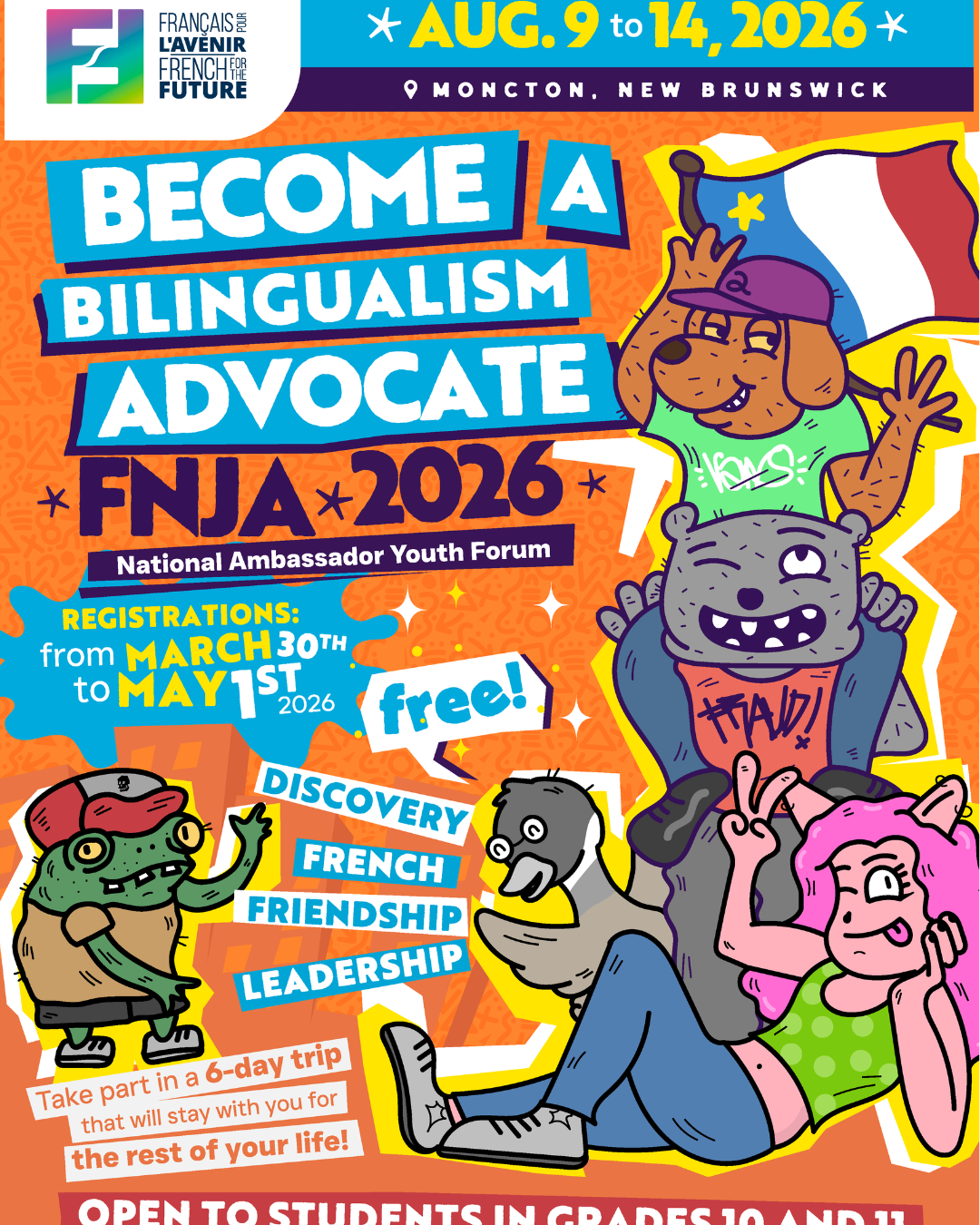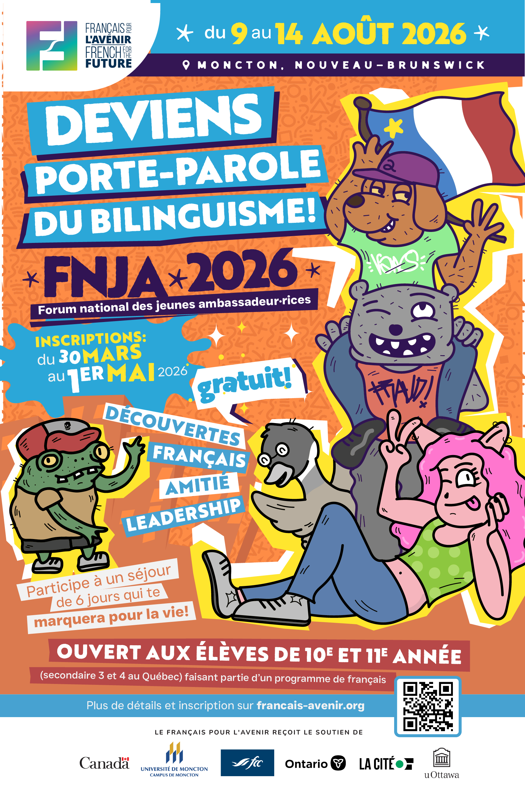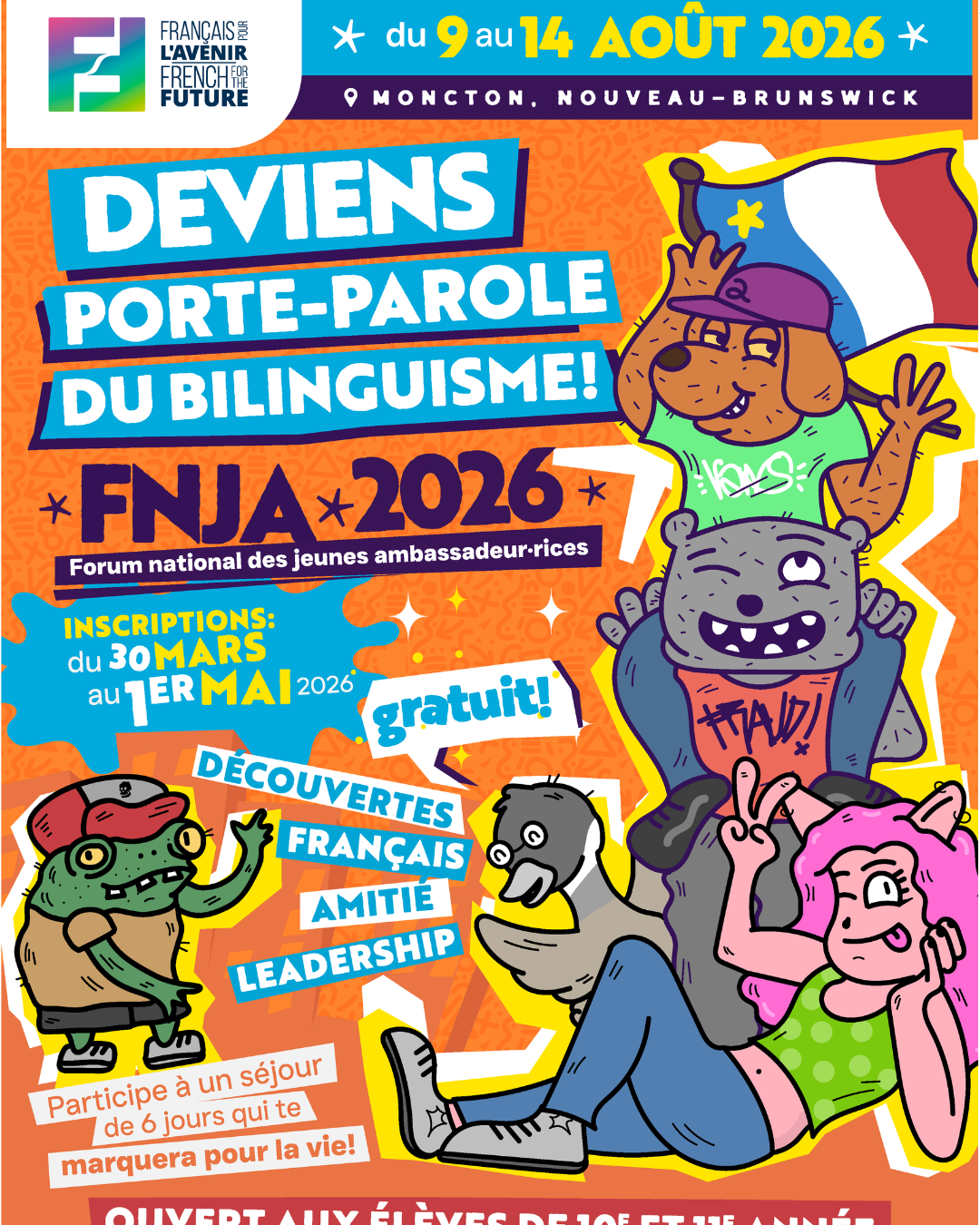 Le FNJA a lieu dans une ville différente chaque année. Cette année, participe à une aventure de 6 jours à Moncton, NB, du 9 au 14 août 2026 : une semaine dynamique comprenant des ateliers, des activités et des expériences inoubliables autour de l’importance du bilinguisme. Le voyage, l’hébergement et toutes les activités sont gratuits pour les participant·es.