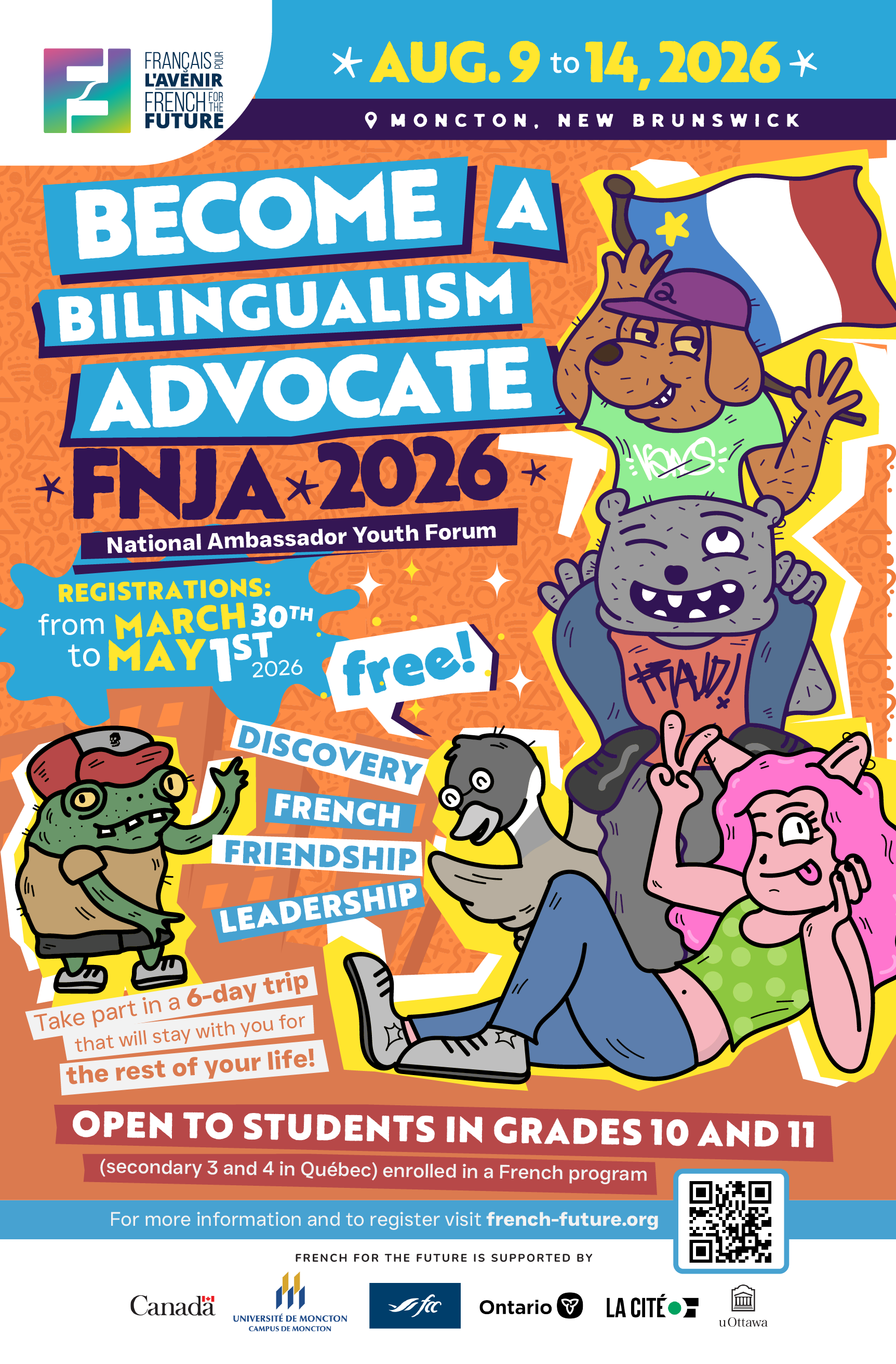 Your mission as an ambassador is to promote the French language and official bilingualism in your school throughout the year following the FNJA by organizing activities related to French.
